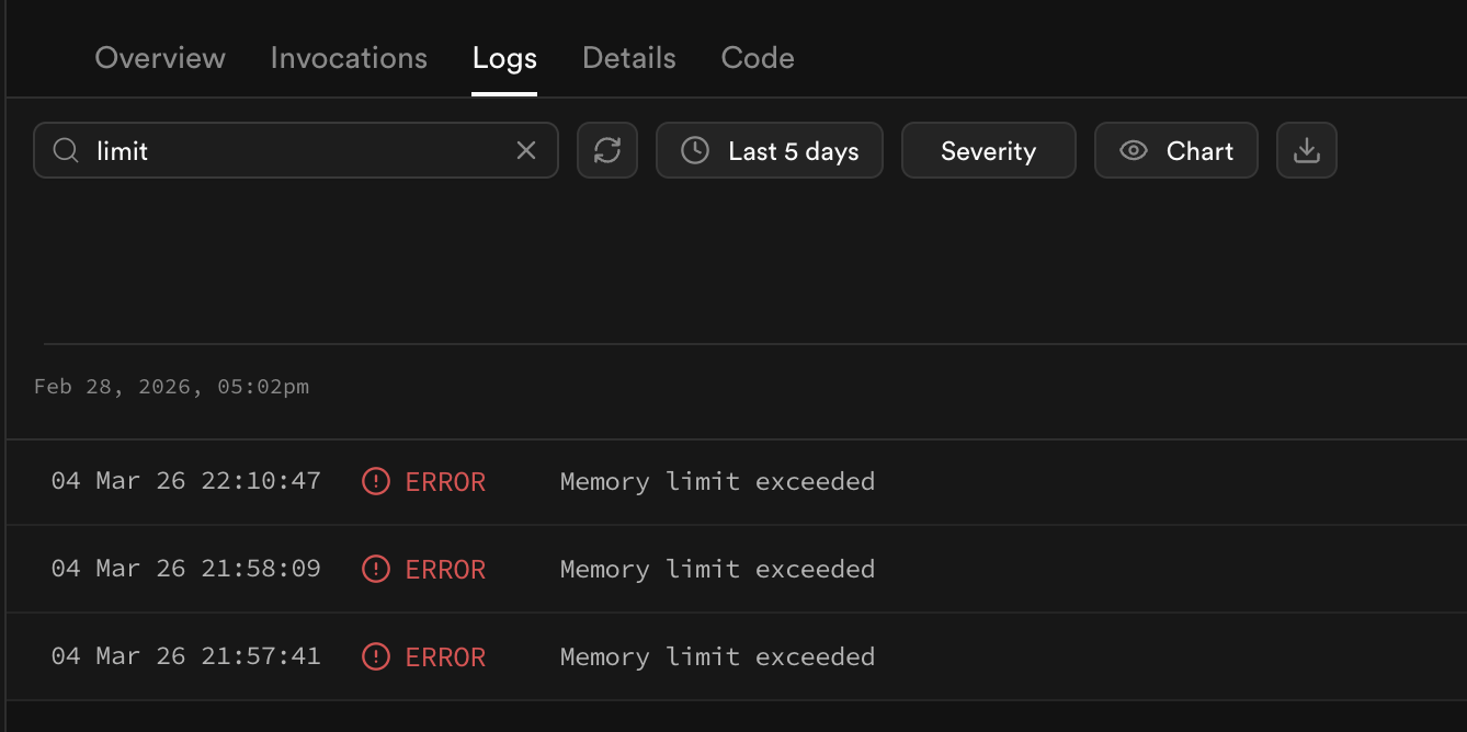 1{2 "code": "WORKER_LIMIT",3 "message": "Function failed due to not having enough compute resources (please check logs)"4}In the function dashboard's Logs tab, you can find the specific error message: